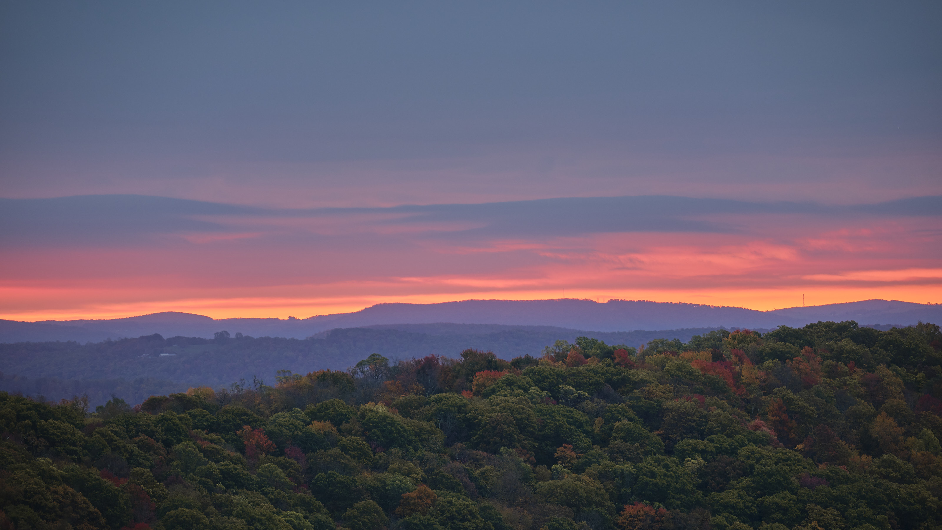 There's a trail to an outlook that makes for great sunrise photos. The sun rises just above the mountains in the distance, and the valley below fills with fog on cool fall mornings. I arrived well before sunrise to set up and wait. The glowing horizon lighting up the colorful mountains never gets old.