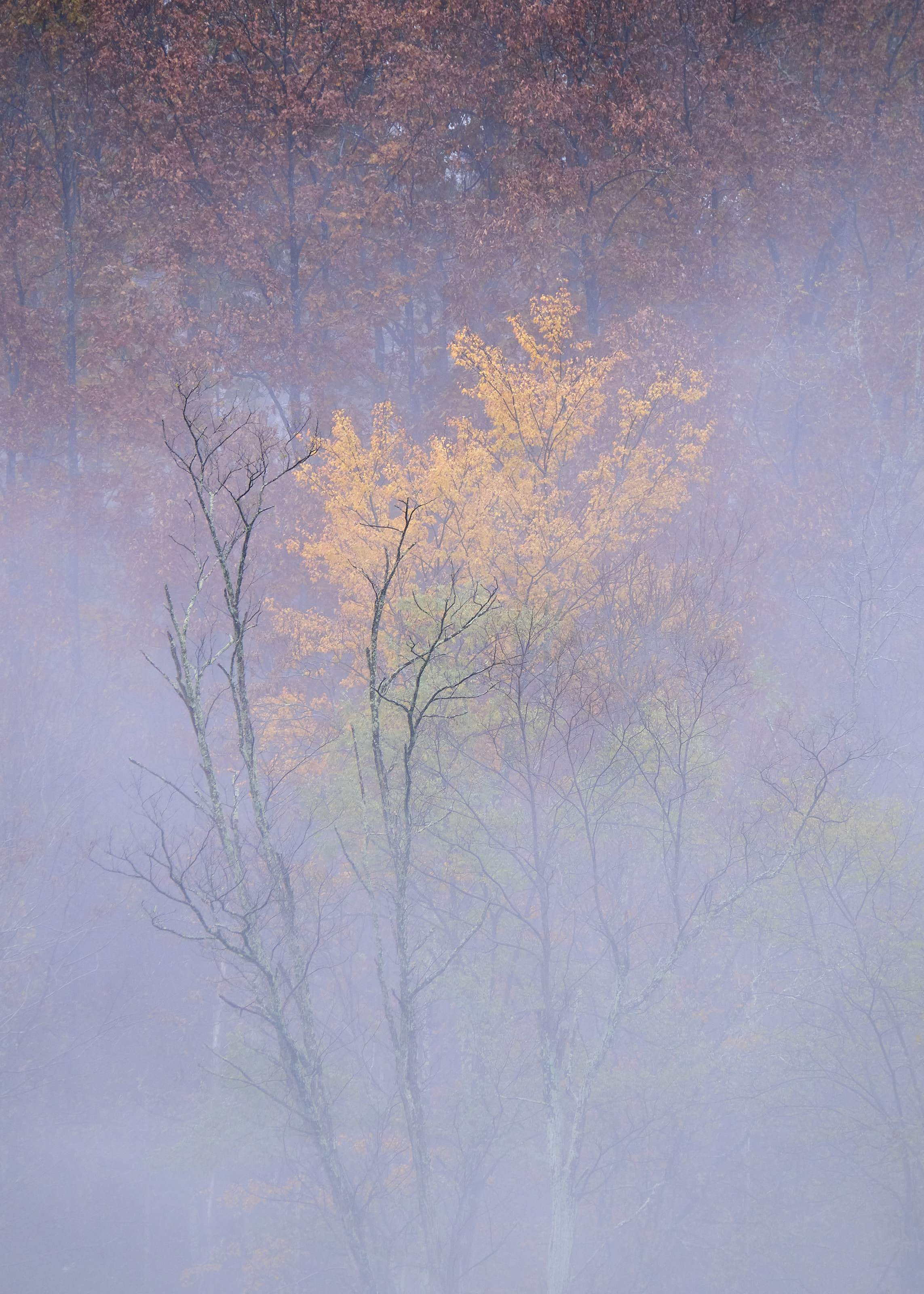 The forecast was promising dense fog, so I drove up to a higher elevation where I thought the fog might be heavier. In spots it felt like you couldn't see 15ft in front of you. I tried to compose this scene both with/without the base of the front tree, but this was the clear winner. I like the way the trees drop off in a "flying v" formation, it helps emphasize the standout tree a bit more.