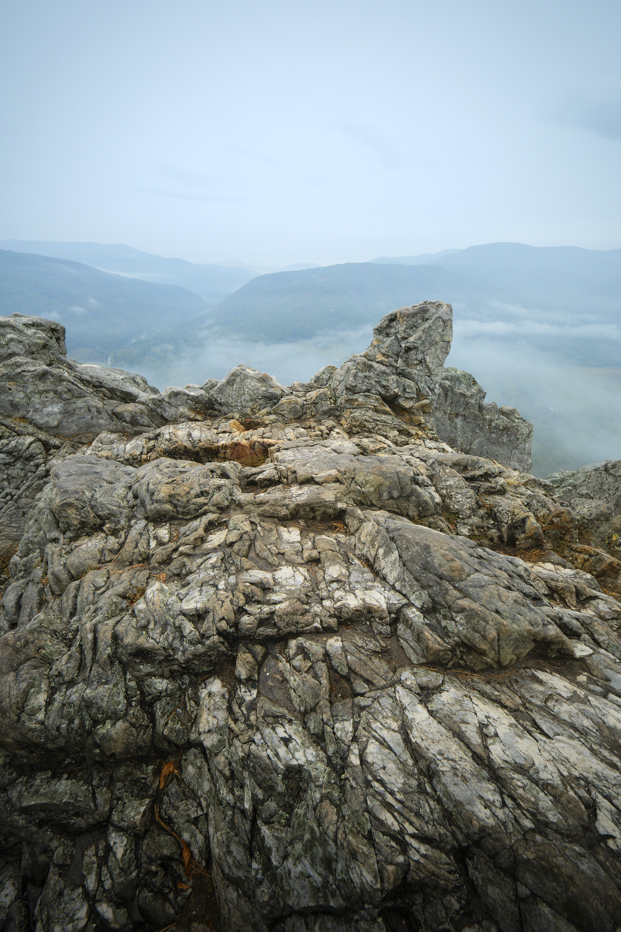 This photo is from the top of Seneca Rocks, which is a sliver of rock projecting out of the mountain side. After a couple mile hike up the mountain, finally passing a sign warning you to turn back because the rest of the way is not safe, you end up here. The stance is suspect, with the rock being 8-10ft wide and vertical drops of 1,500ft straight down on both sides, but the view is worth it. It was a really foggy morning. After hiking at sunrise, I spent a few hours in a safe "seat", admiring the 360 degree views.